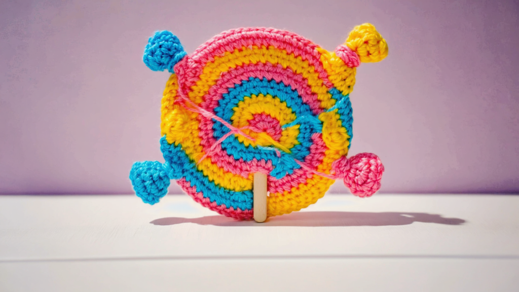 This playful page includes a spinning lollipop and small crocheted candies. The lollipop is attached with a button so it can rotate.