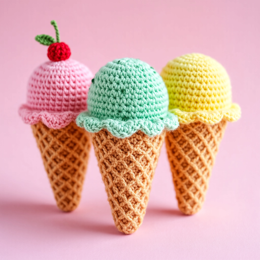 Create a waffle-textured cone using front post double crochet stitches. Add colorful ice cream scoops and attach them with magnetic buttons.