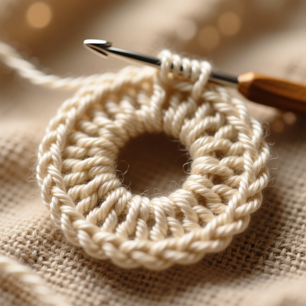 You’ll complete the first round with 16 stitches, forming the base of your square.