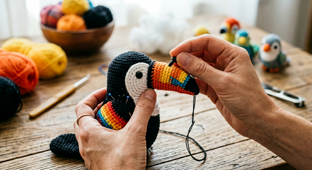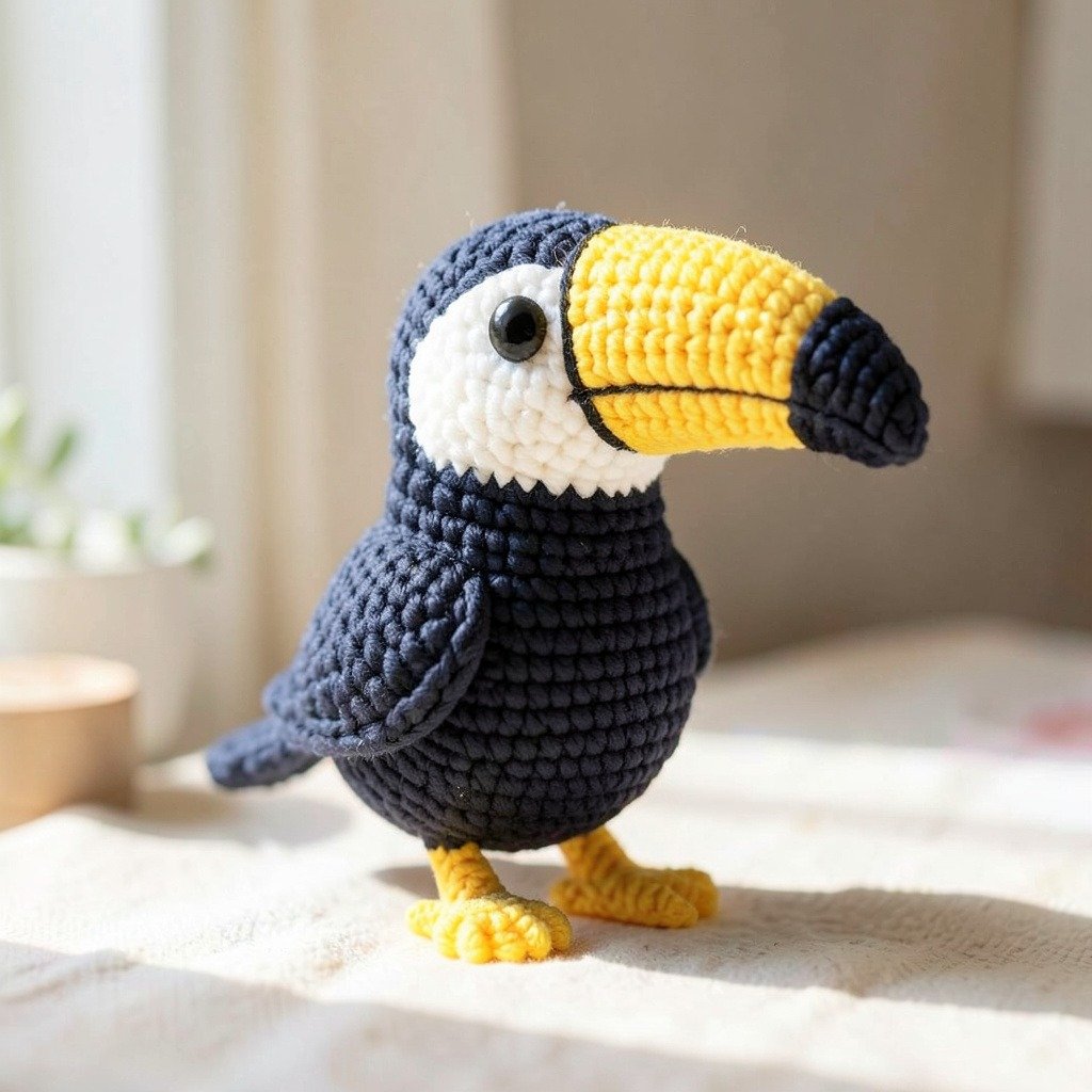 This crochet toucan pattern uses standard amigurumi techniques, making it beginner-friendly.