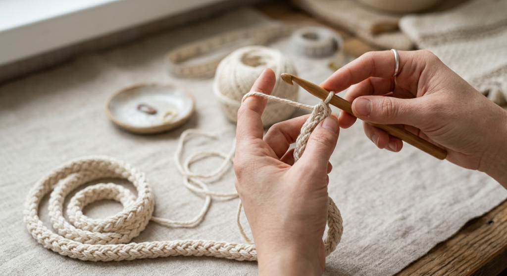 Start by chaining and working half double crochet stitches in rounds to form the base of the bag. The structure is simple and repetitive, making it ideal for beginners.
