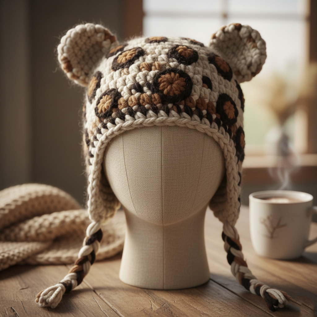 The leopard hat is bold, trendy, and perfect for winter fashion. It features generous earflaps, stuffed ears, and customizable crochet spots for a realistic look.