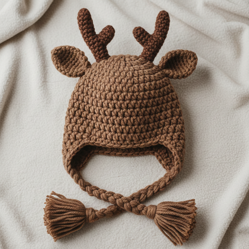 This woodland-inspired deer hat features crocheted antlers, stuffed muzzle, and button eyes for an adorable finish. Unlike some designs, the ears are not stuffed, keeping them lightweight.