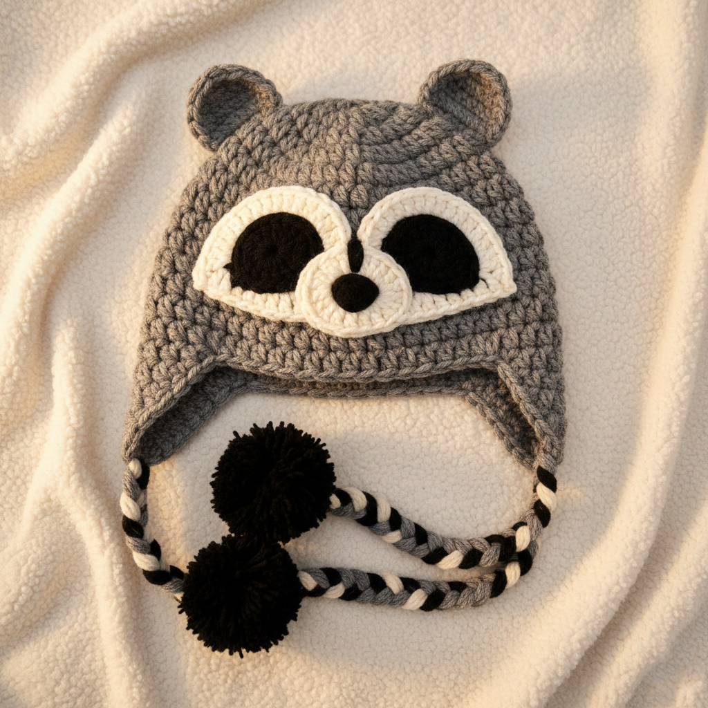 The raccoon hat uses contrast colors to create the iconic mask look. The facial features are crocheted separately and attached for dimension and character.
