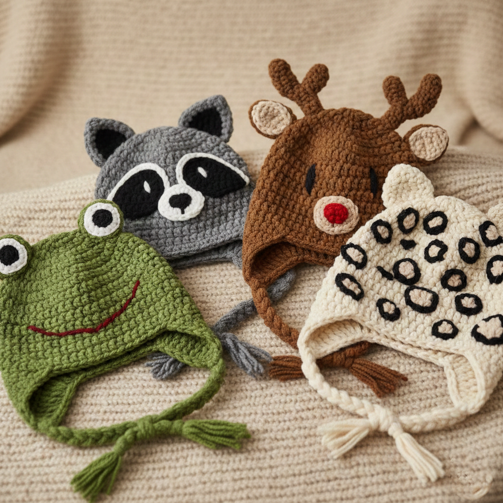 From woodland creatures to safari animals, this collection includes 15 unique crochet hat patterns that are perfect for winter gifts, craft fairs, or playful cold-weather outfits.