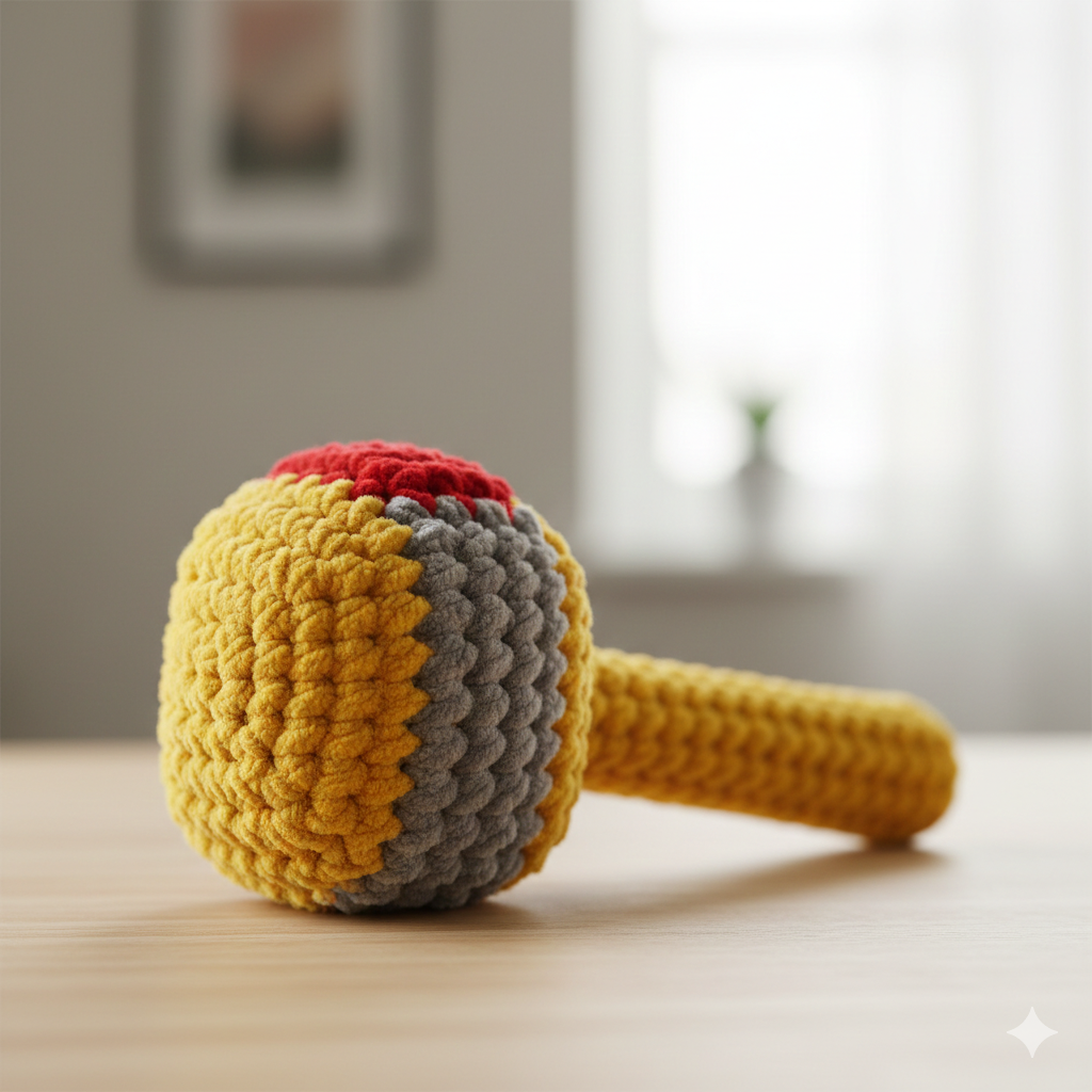 For an extra fun detail, the pattern includes a crocheted hammer worked in mustard, grey, and red.