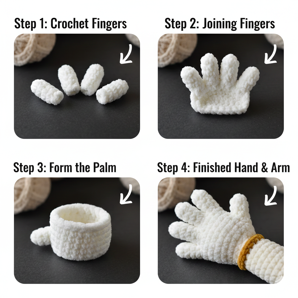 The palm is lightly stuffed to keep it flat. After shaping decreases, continue the arm in ivory and finish with a clean folded closure.