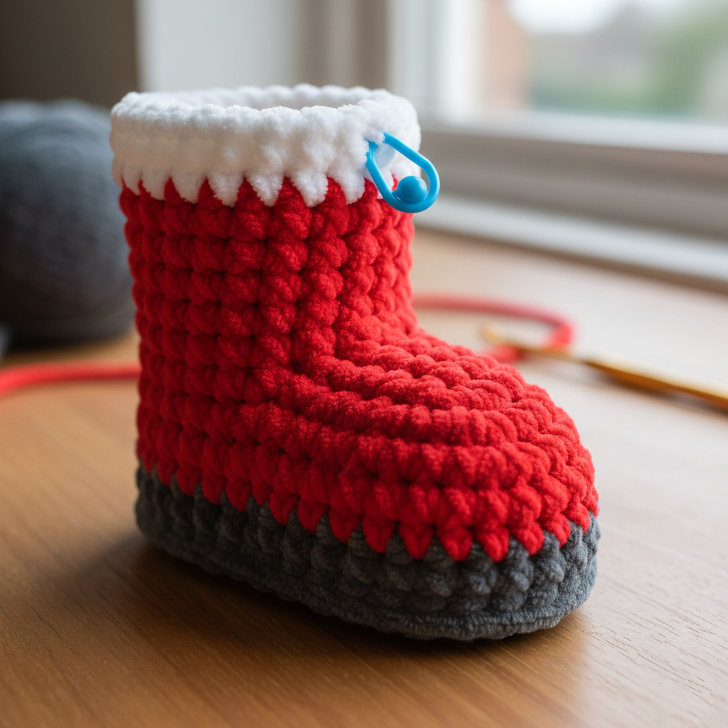 The legs begin with an oval foundation chain worked in the round. Grey and red yarn create the signature boot base, shaped using strategic decreases.
