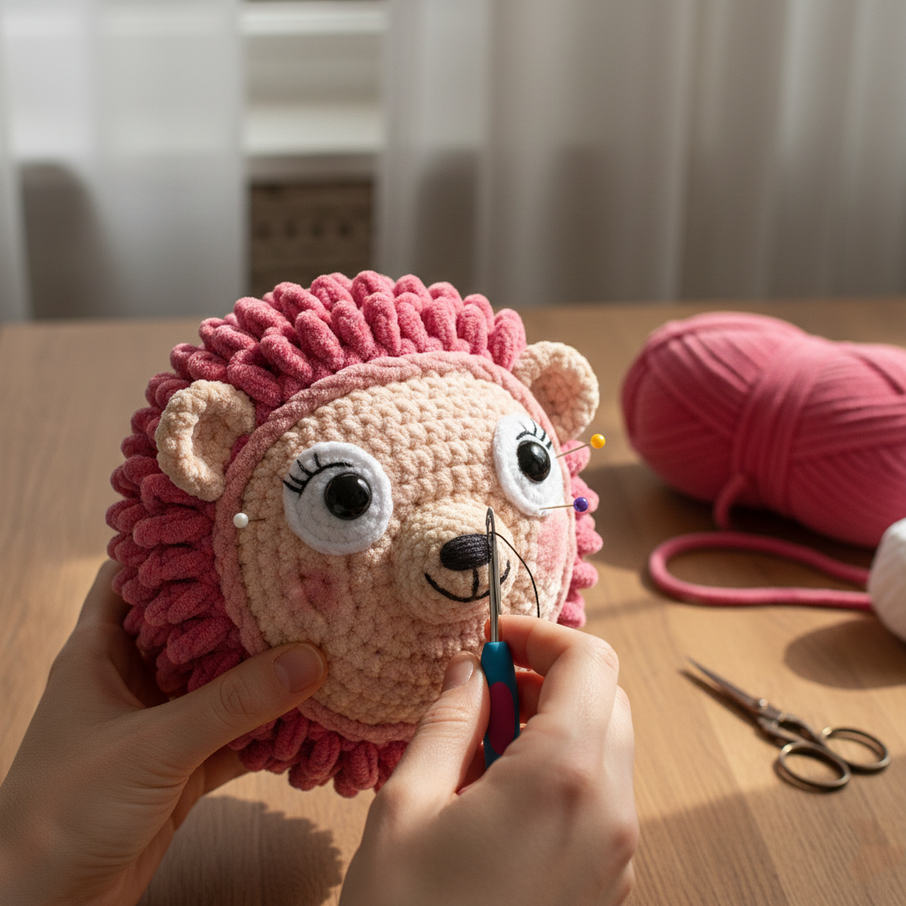 Ears are made in two parts (inner ivory and outer pink) and crocheted together. The prickles are worked separately, folded, and sewn securely onto the head.
