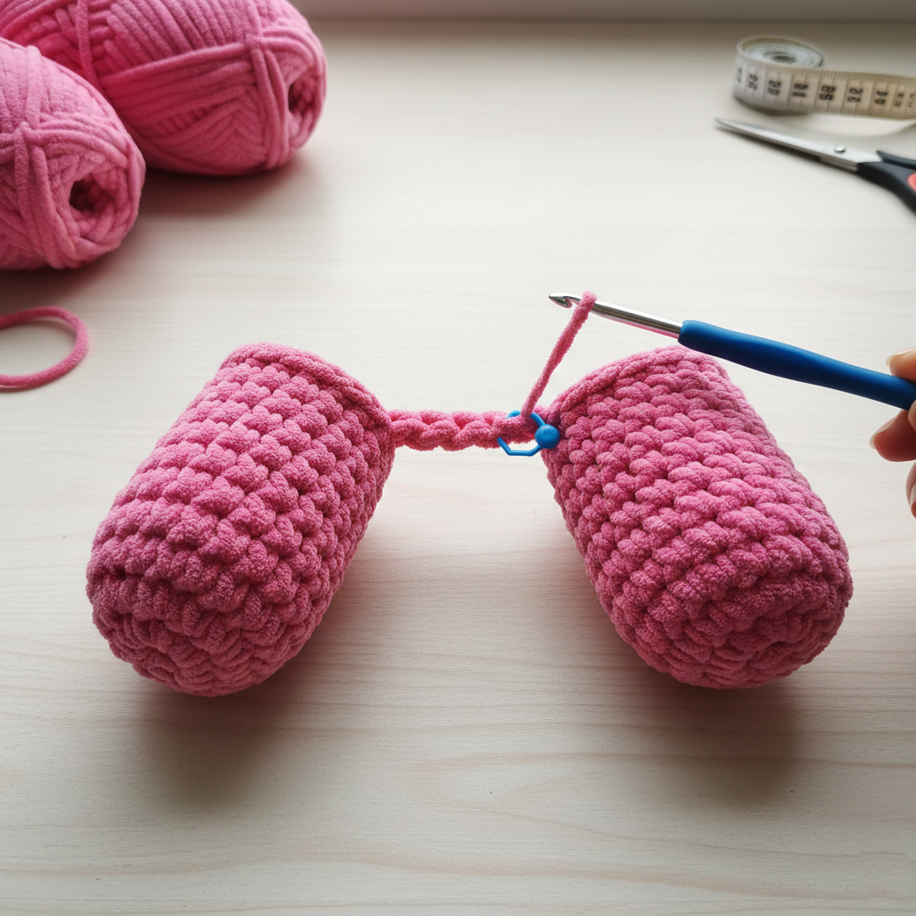 The legs are joined with a short chain bridge. Continue crocheting in the round to build the torso while stuffing gradually.