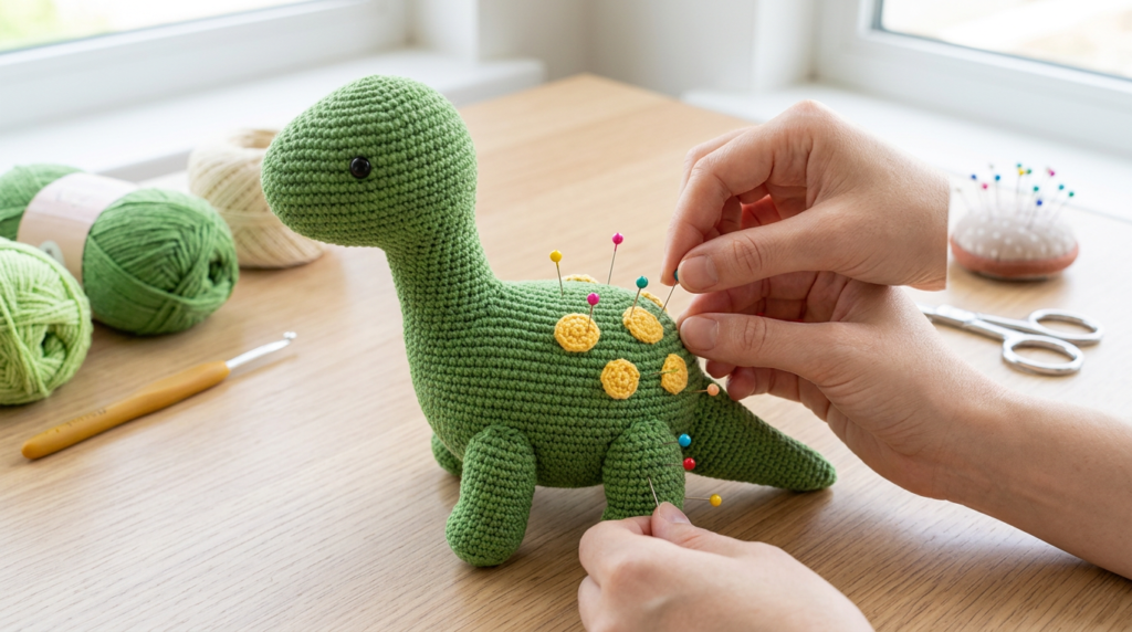Pin spots in place before sewing to ensure balanced placement. This customization makes each baby dinosaur unique.