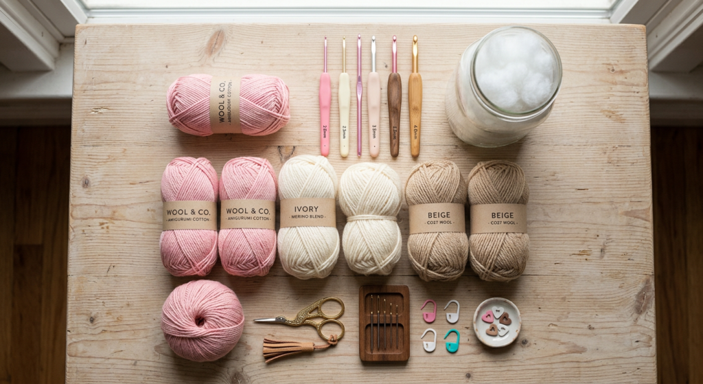 You’ll also need a 1.5 mm and 3 mm crochet hook, fiberfill stuffing, tapestry needle, scissors, black and white yarn for embroidery, and optional safety eyes.