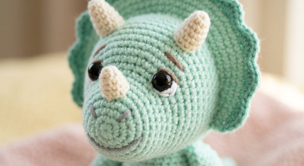 The Triceratops starts with a rounded head worked in continuous rounds from a magic ring. Gradual increases shape the face, while strategic decreases close it smoothly.
