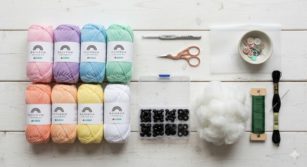 This pattern uses sport weight 4ply yarn (like YarnArt Jeans) in white, cream, brown, peach, gray, and blue. You’ll also need safety eyes (8mm), fiberfill stuffing, wire for the frame, plastic sheet for structure, embroidery thread, and a 1.5 mm crochet hook.