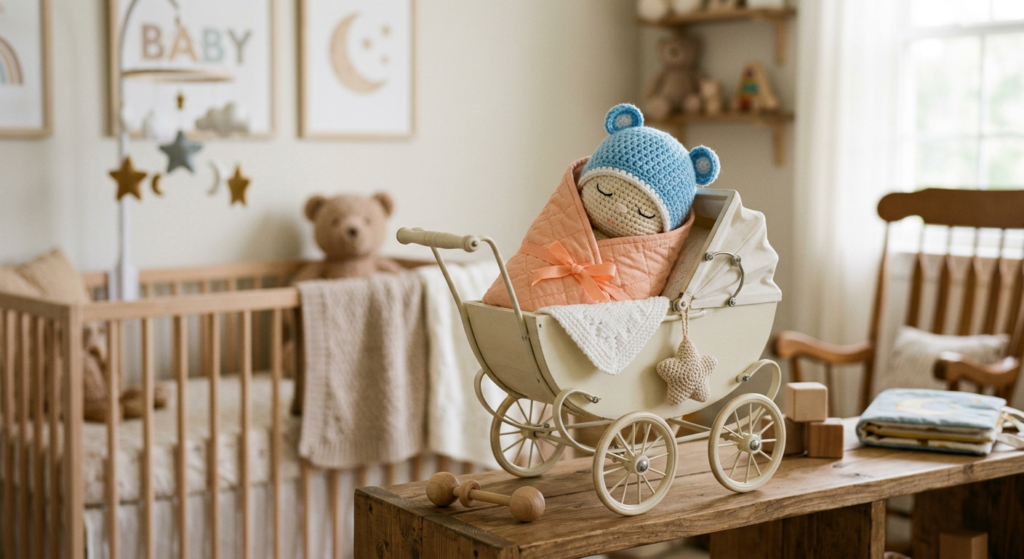 Perfect for advanced beginners and intermediate crocheters, this step-by-step pattern creates a 9–10 cm doll and a 14–16 cm carriage — ideal for gifts, nursery décor, or handmade keepsakes.