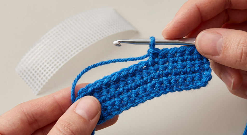 The cradle sides are worked in rows using blue and peach yarn, then joined together with single crochet stitches. A plastic insert is placed inside to give stability and shape.