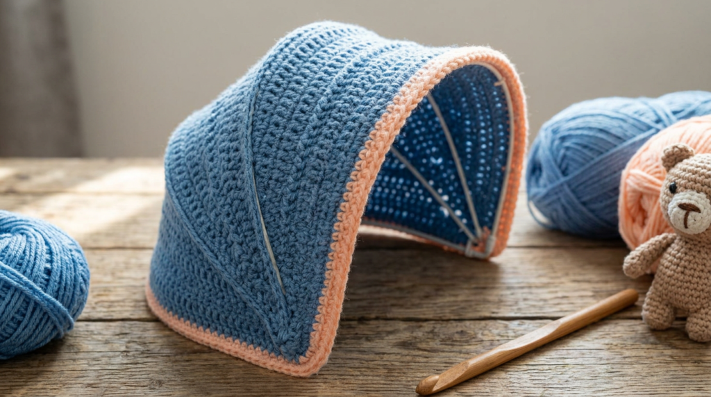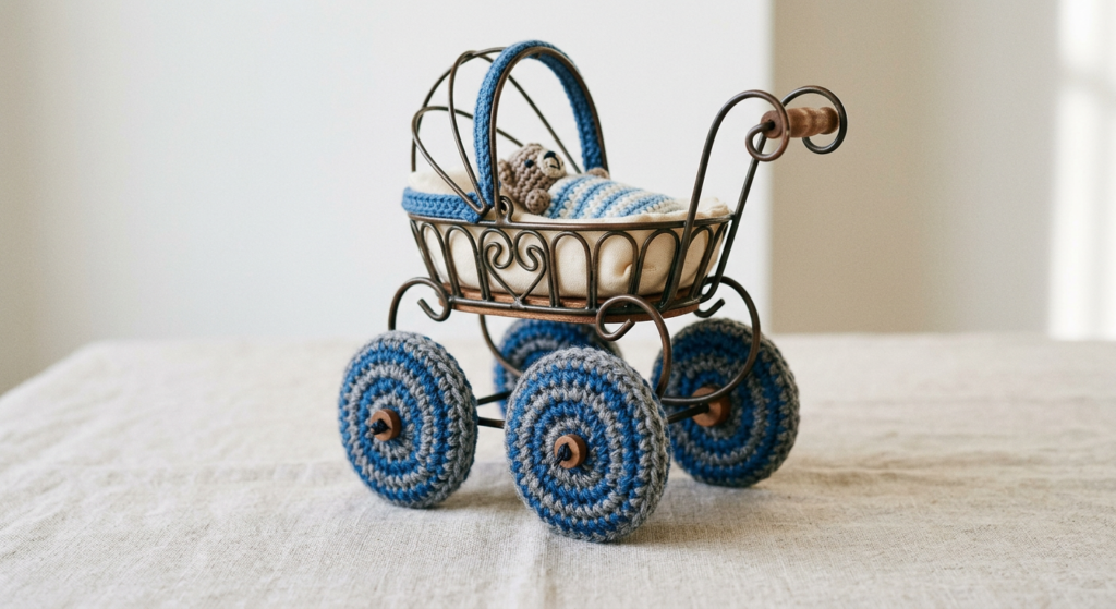 The base is crocheted separately and attached using reverse single crochet for a neat, polished edge. This technique gives the baby carriage a professional amigurumi finish.
