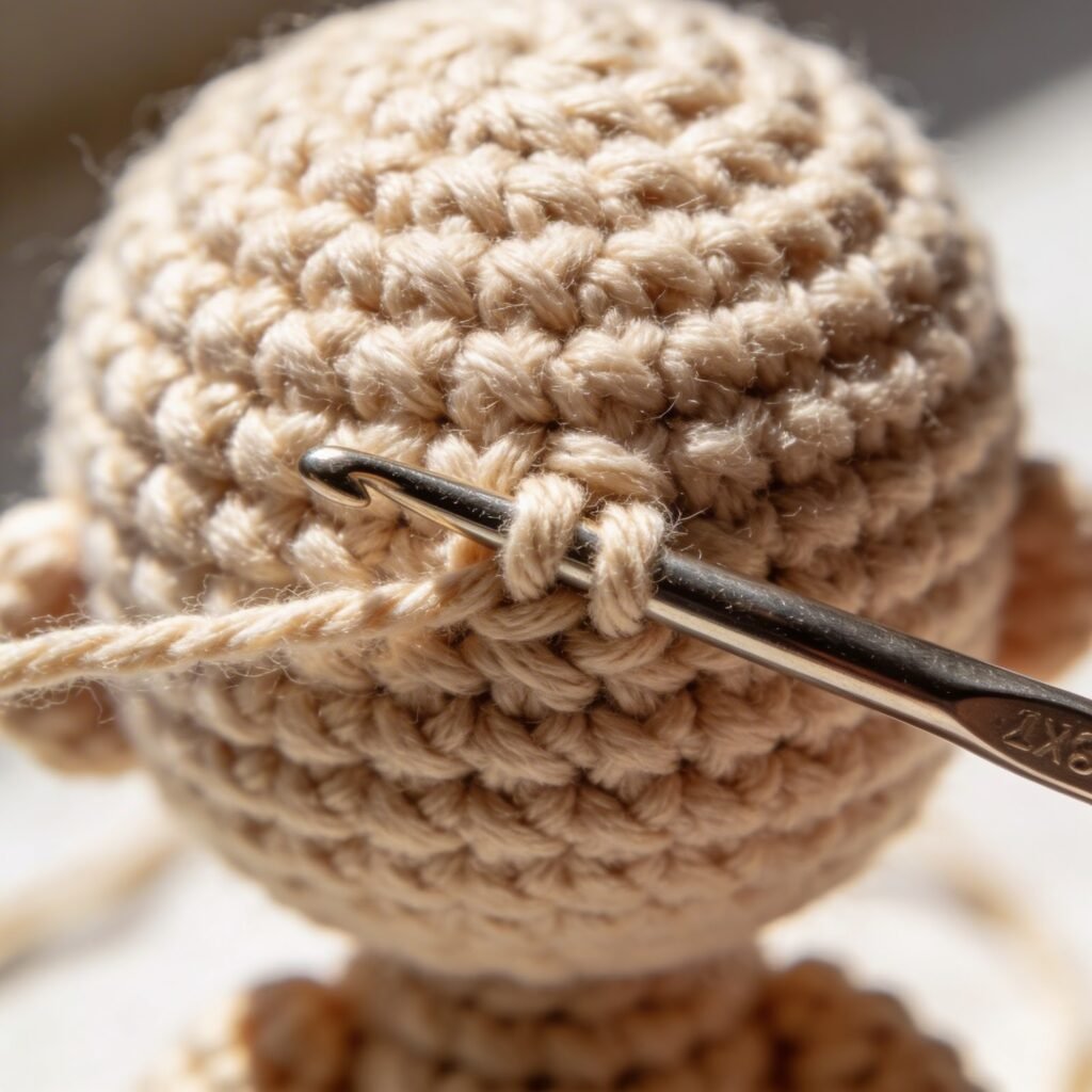These stitches help form the rounded head, body structure, and detailed hair strands.