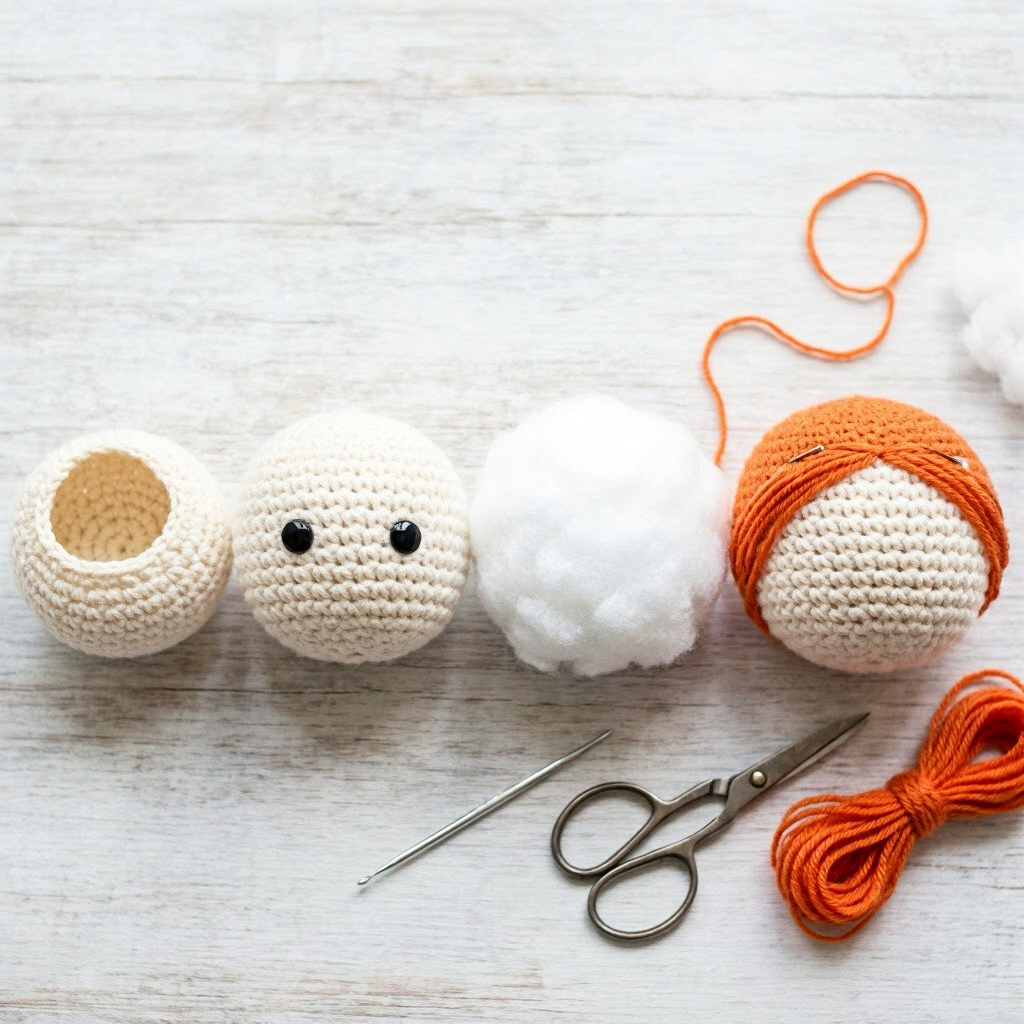 Adding fiberfill stuffing every few rounds helps keep the doll evenly shaped and stable.