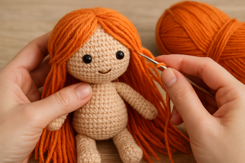 For the hair, orange yarn is used to create layered strands attached to the head. The strands are arranged to frame the face and create the witch’s hairstyle.