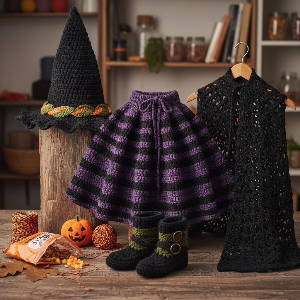 Beatrix’s charming outfit includes several crocheted accessories that complete her magical look.