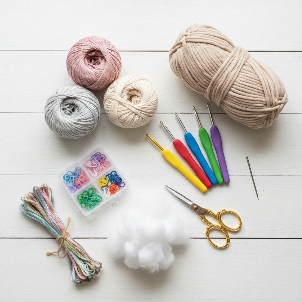 For the blanket and pillow, soft wool-blend yarn works beautifully. Small toys are made with fine cotton yarn and a 1.25 mm hook for detailed amigurumi shaping.