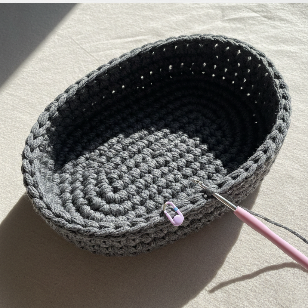 The gray crochet bed starts by creating a rectangular base using single crochet rows. After building the flat bottom, you crochet around the edges using half double crochet to form raised sides.