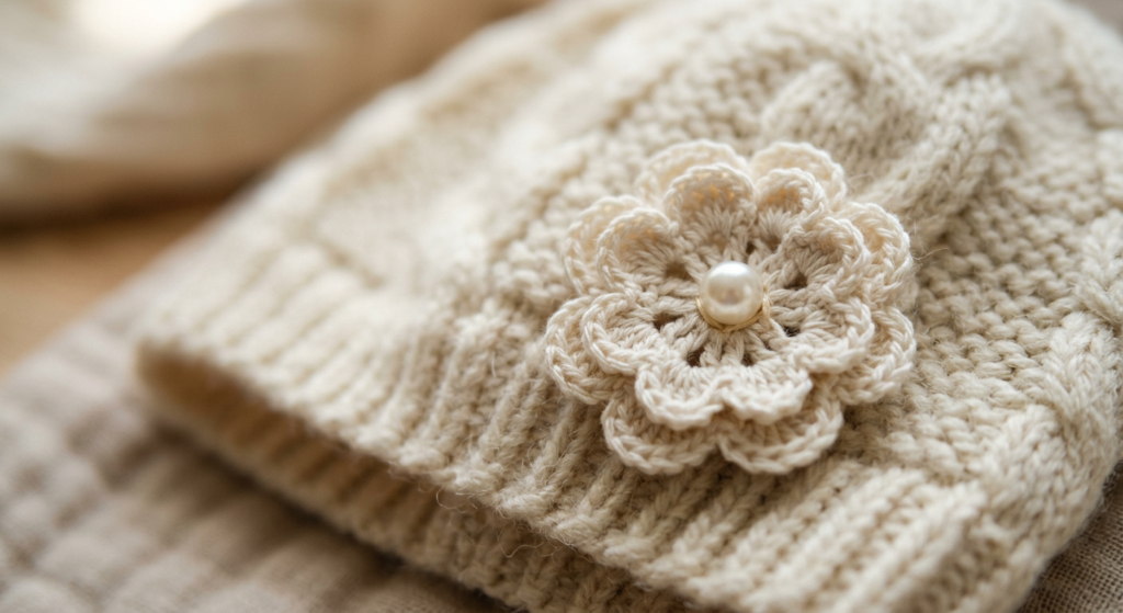 Create another five-petal flower and sew it onto the hat. Adding a pearl bead in the center gives the hat a soft, vintage look.