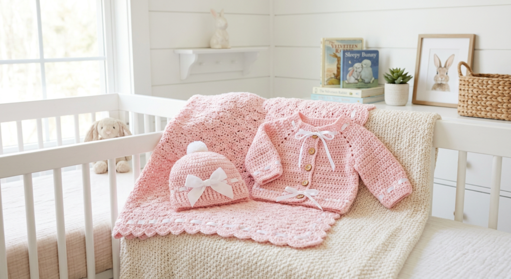 If you’re looking for a crochet baby blanket pattern with matching cardigan and hat (3–6 months), this soft baby pink set is the perfect handmade gift. It’s elegant, beginner-friendly, and ideal for baby showers or newborn photography.