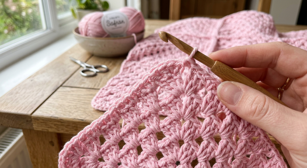 Using a 6mm hook, begin with a small chain ring and build structured corners with double crochet clusters. Each round adds one extra 3DC group between corners, making it easy to adjust the blanket size.