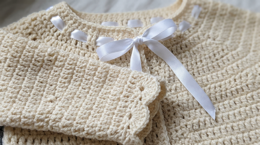 Weave white satin ribbon through every third double crochet stitch along the neckline row for a delicate closure.