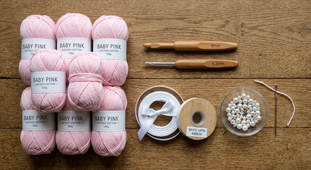 You’ll need approximately 350g of baby pink DK yarn (Light Worsted / 8ply), a 6mm and 4.5mm crochet hook, white satin ribbon (approx. 90cm), 3 small white pearl beads (optional), and a yarn needle for finishing.