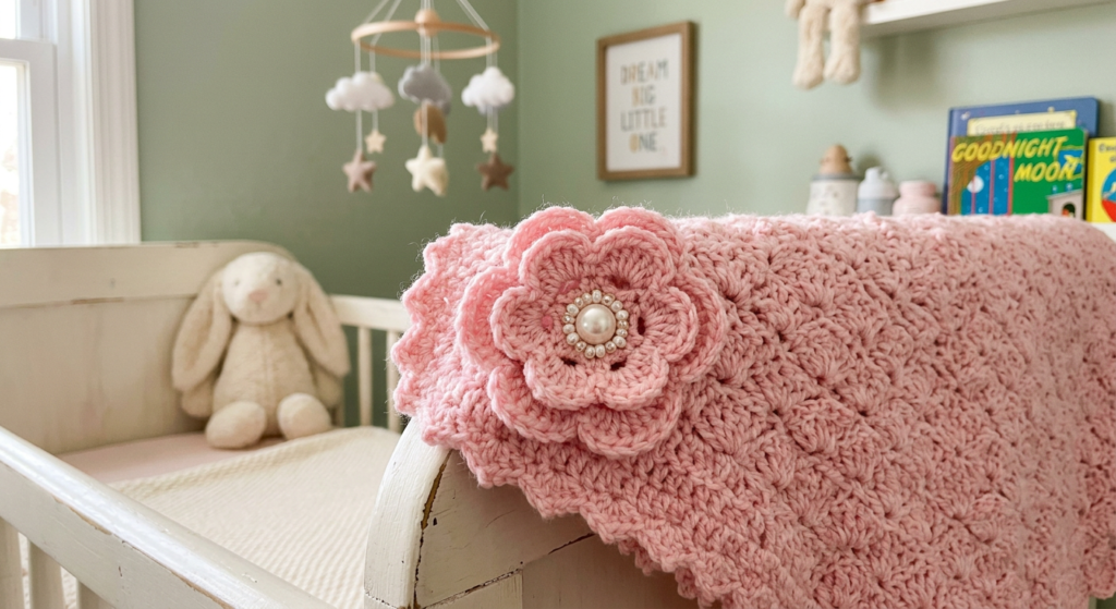 To elevate the design, crochet a five-petal flower using treble stitches and attach it to one blanket corner. Add a pearl bead in the center for a delicate boutique finish.
