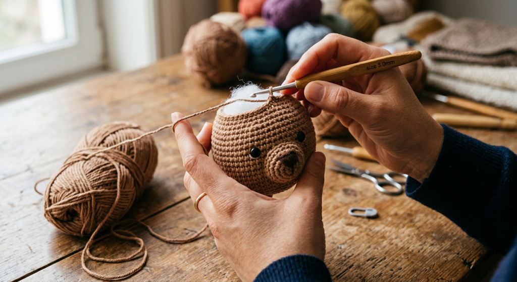 When crocheting amigurumi toys, use tight stitches and consistent tension to avoid gaps where stuffing might show. A small hook size helps keep the fabric dense and neat.