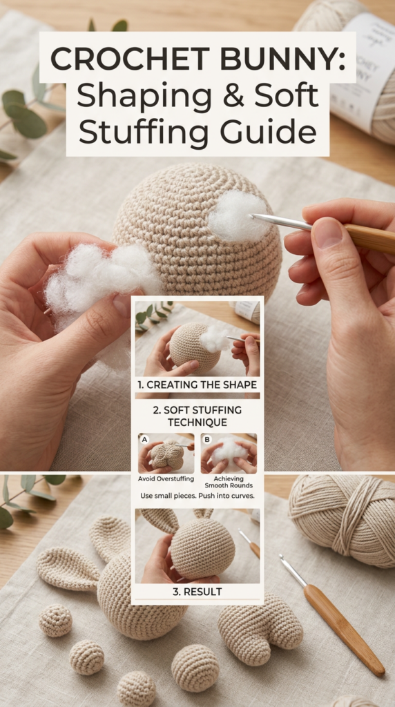 As you crochet upward, the head is shaped with increases and decreases, then stuffed to create a soft plush structure—perfect for amigurumi bunny beginners.