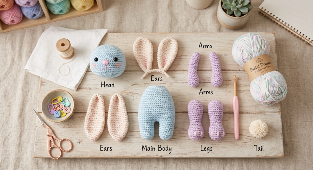 These components are ideal for beginners searching for easy amigurumi limbs tutorial and crochet bunny body parts pattern.