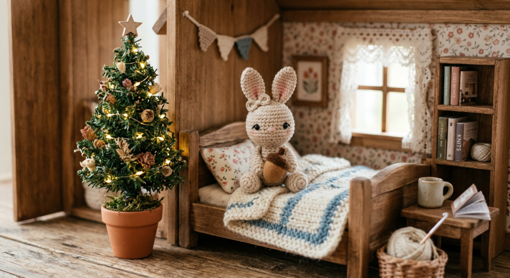 This pattern includes extra elements like a mini bunny, blanket, pillow, garland, and even a tiny Christmas tree. These accessories bring life to the dollhouse and make it a complete crochet scene.