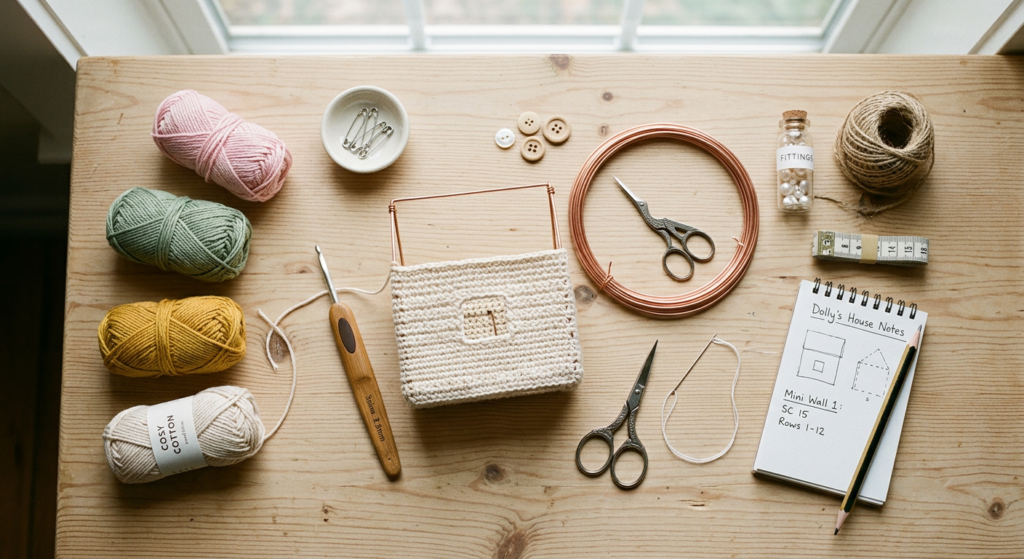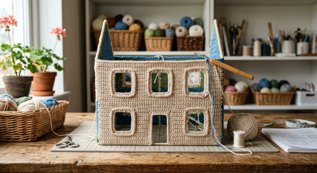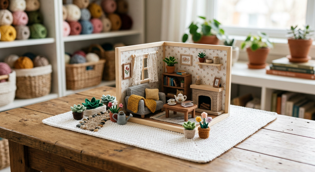 This setup is ideal for those searching for mini crochet house patterns, amigurumi dollhouse tutorials, and DIY crochet home decor.