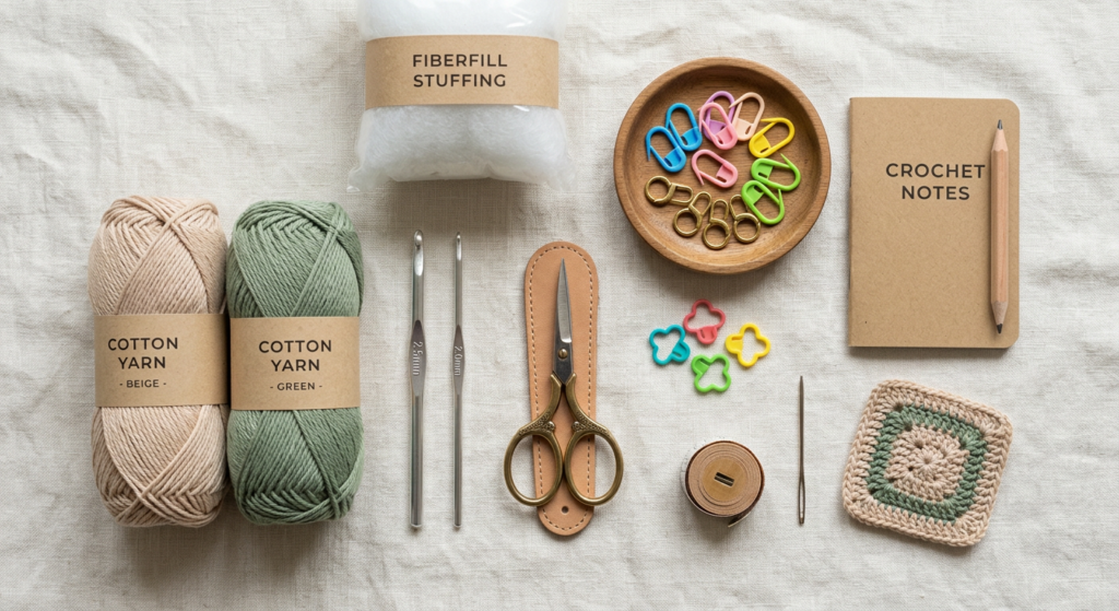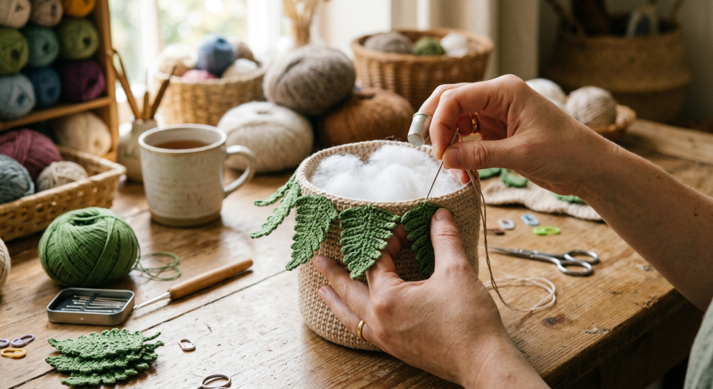 This amigurumi fern plant pattern uses lightweight yarn and small hooks for delicate details. It’s beginner-friendly if you’re comfortable with basic crochet stitches.