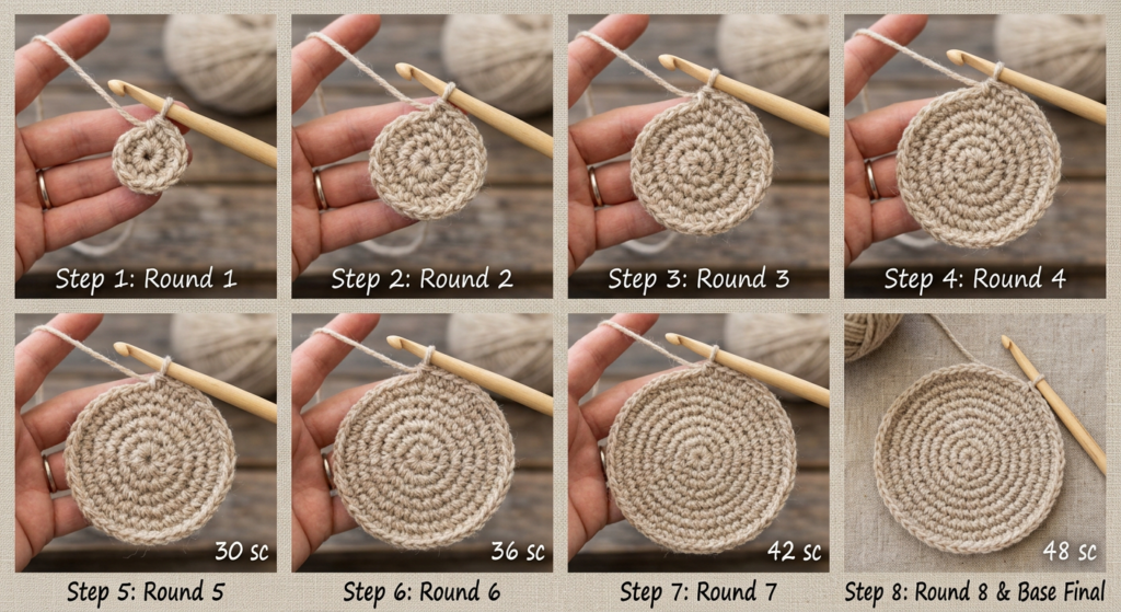 The pot is worked in rounds, starting with a magic ring and gradually increasing to create a rounded base.