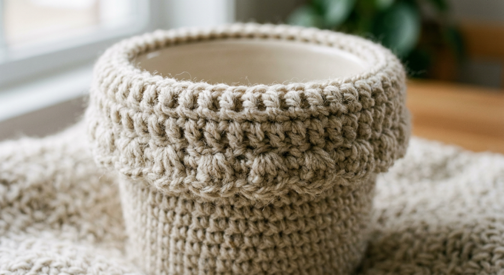 The rim uses double crochet stitches to give the top edge a realistic plant pot look.