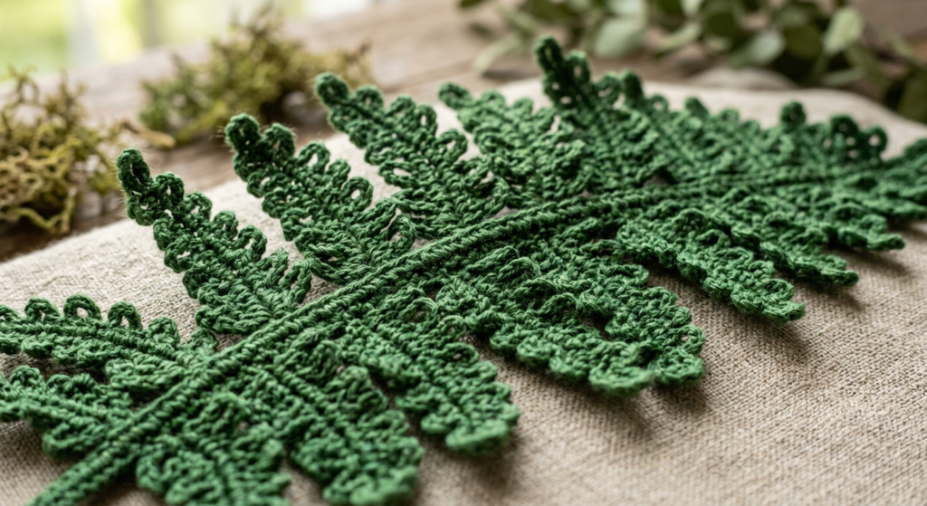 The pattern builds multiple small looped leaf segments to mimic fern fronds. This gives the plant its realistic botanical look.