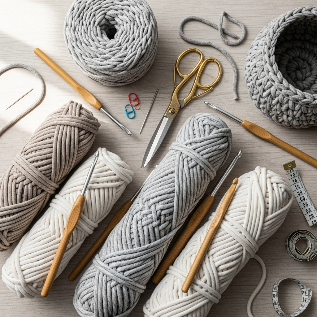 Before starting your crochet baskets, gather the necessary tools and yarn. Strong cord yarn works best because it helps the baskets hold their shape and remain durable.