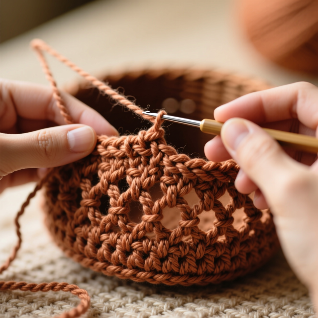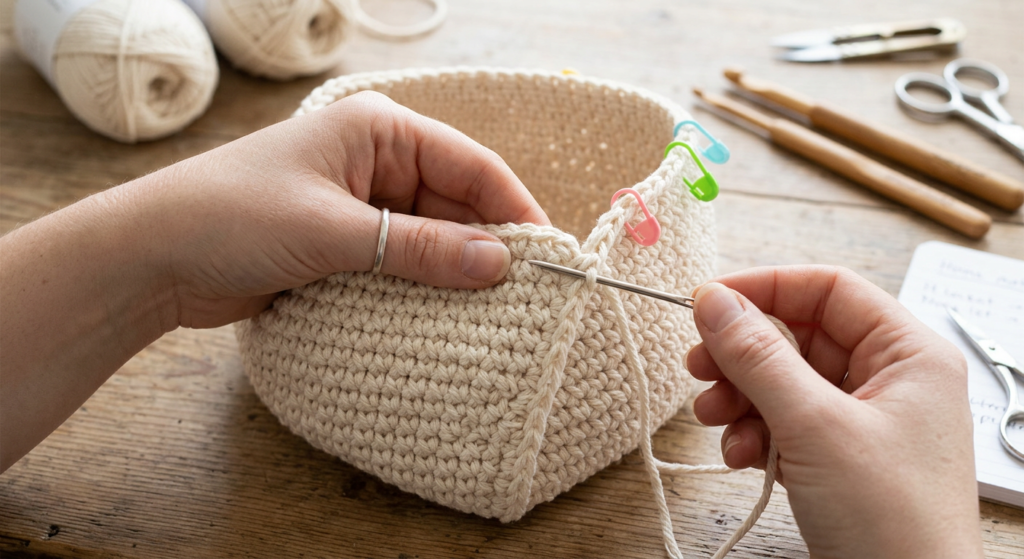 The next rows gradually expand the basket by adding more double crochet stitches.