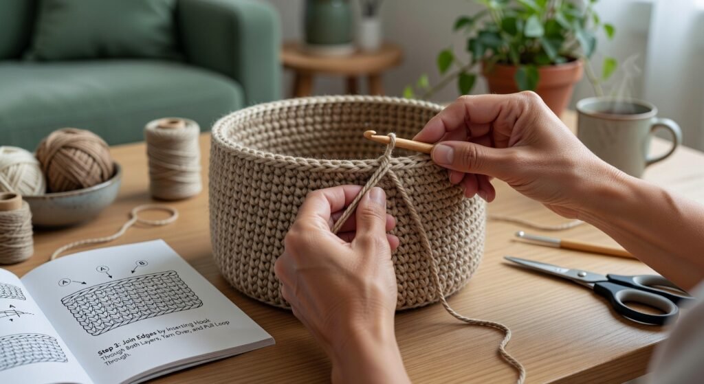 Use slip stitches or a crochet hook to connect the layers together. After joining, weave in the loose yarn ends inside the stitches to keep the basket neat and tidy.