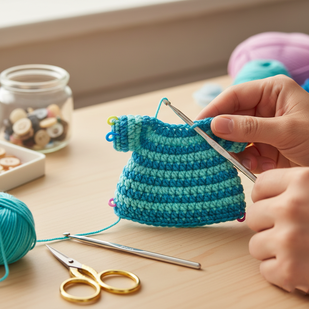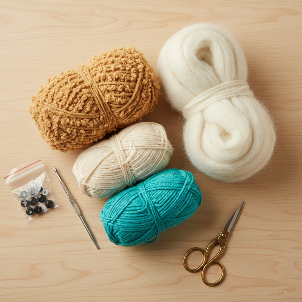 You’ll also need a 2.25mm–2.5mm crochet hook, polyester fiberfill stuffing, safety eyes (8mm–10mm), stitch markers, scissors, and a sewing needle.