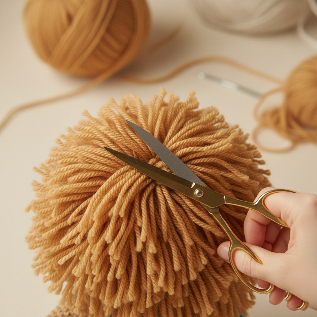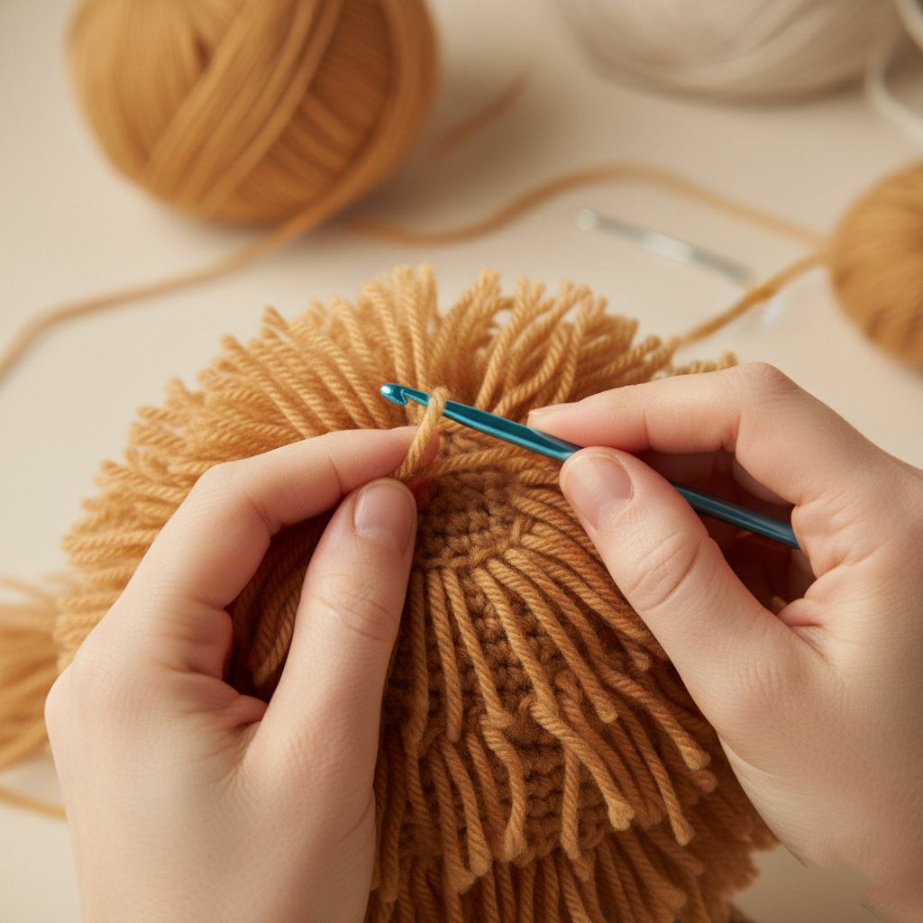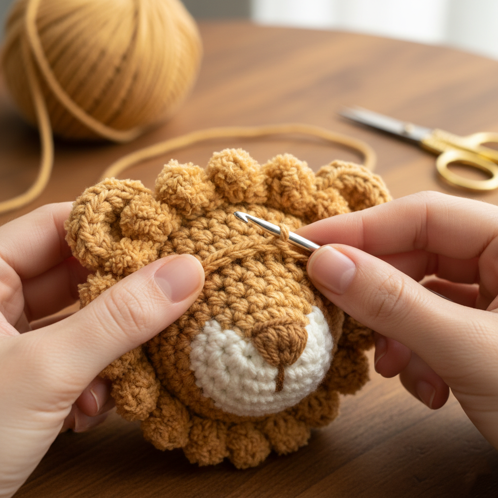 The mane is the most eye-catching part of this crochet lion. Wool strands are cut into equal lengths and attached stitch by stitch using a crochet hook.