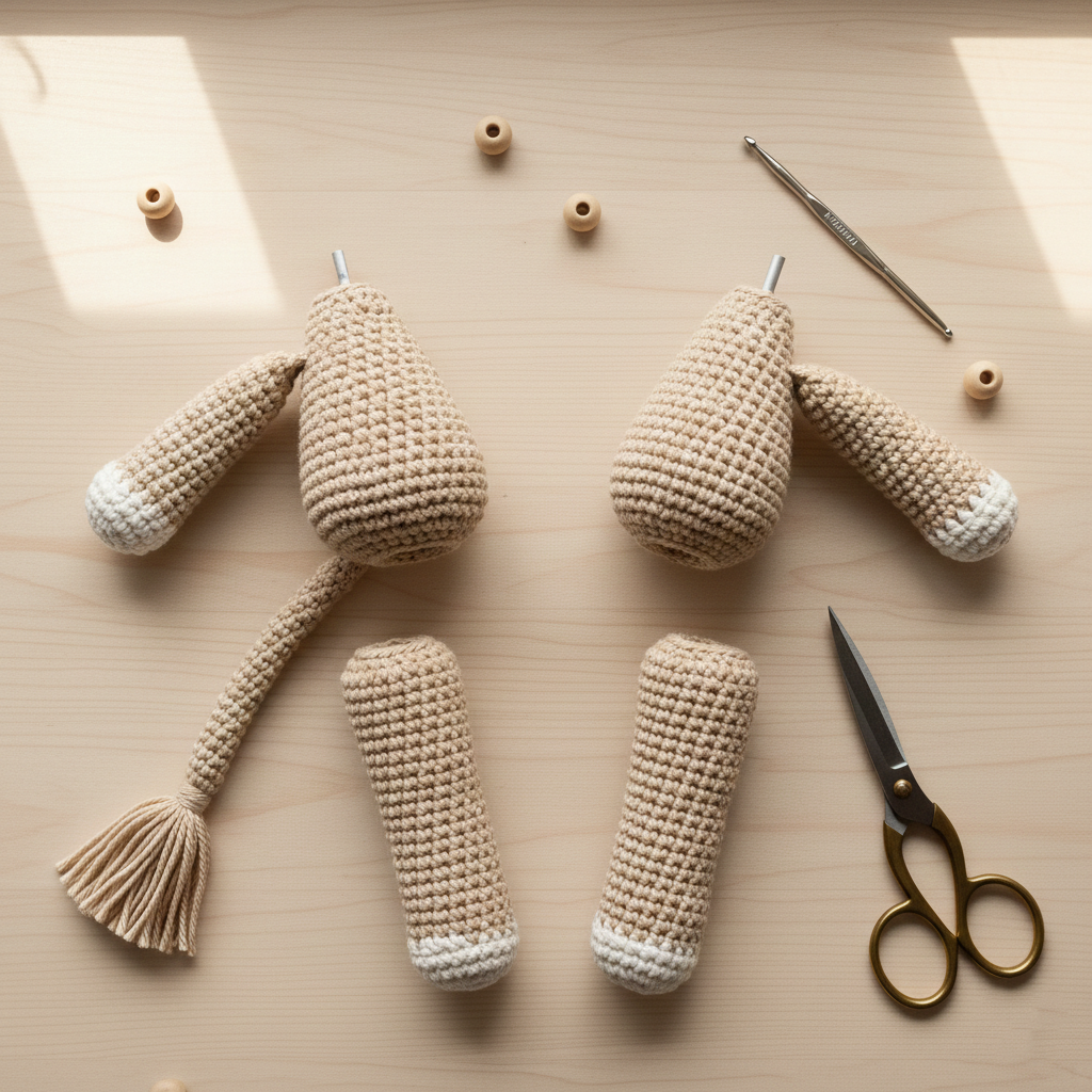 The legs and arms are shaped with strategic decreases to create a natural curved form. The lower sections are stuffed firmly, while the upper rounds remain slightly softer for easier sewing.