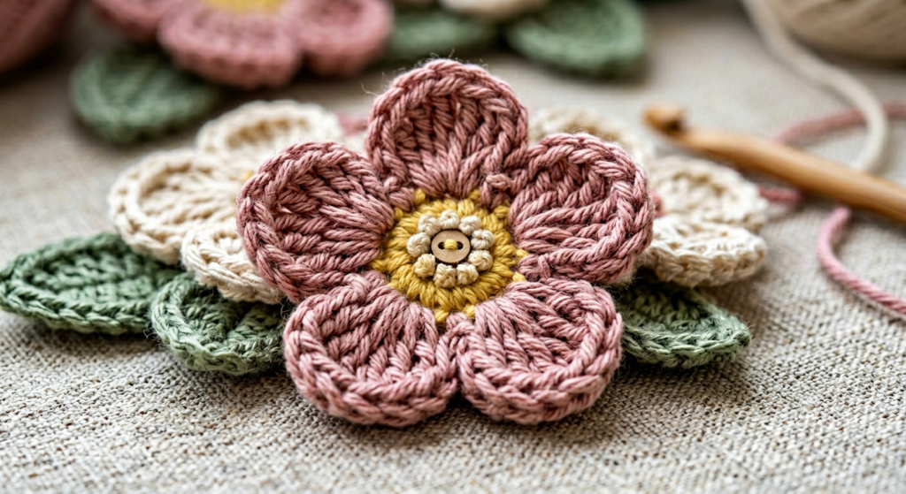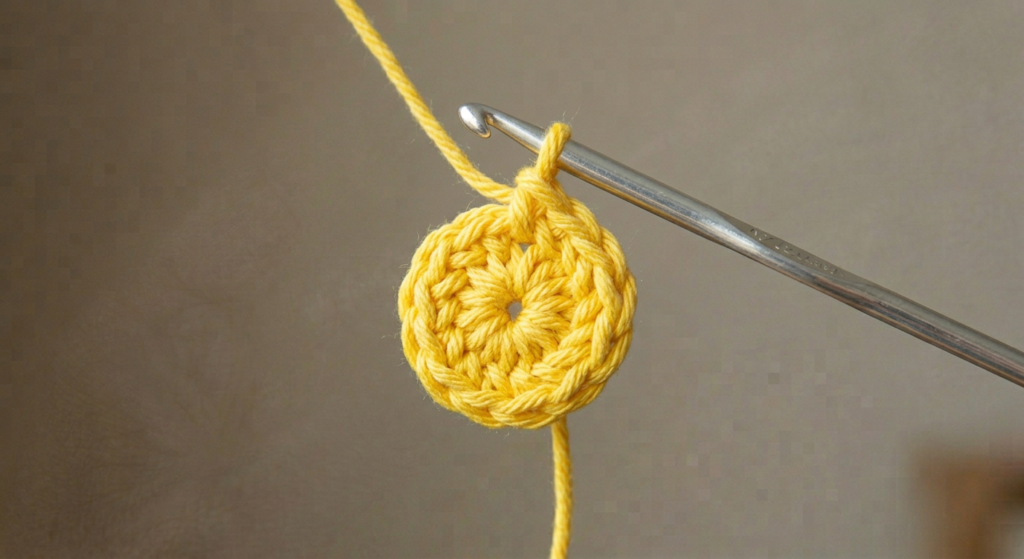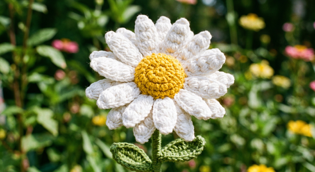 You’ll have 12 cluster stitches total, forming a complete daisy. Fasten off after completing the round.