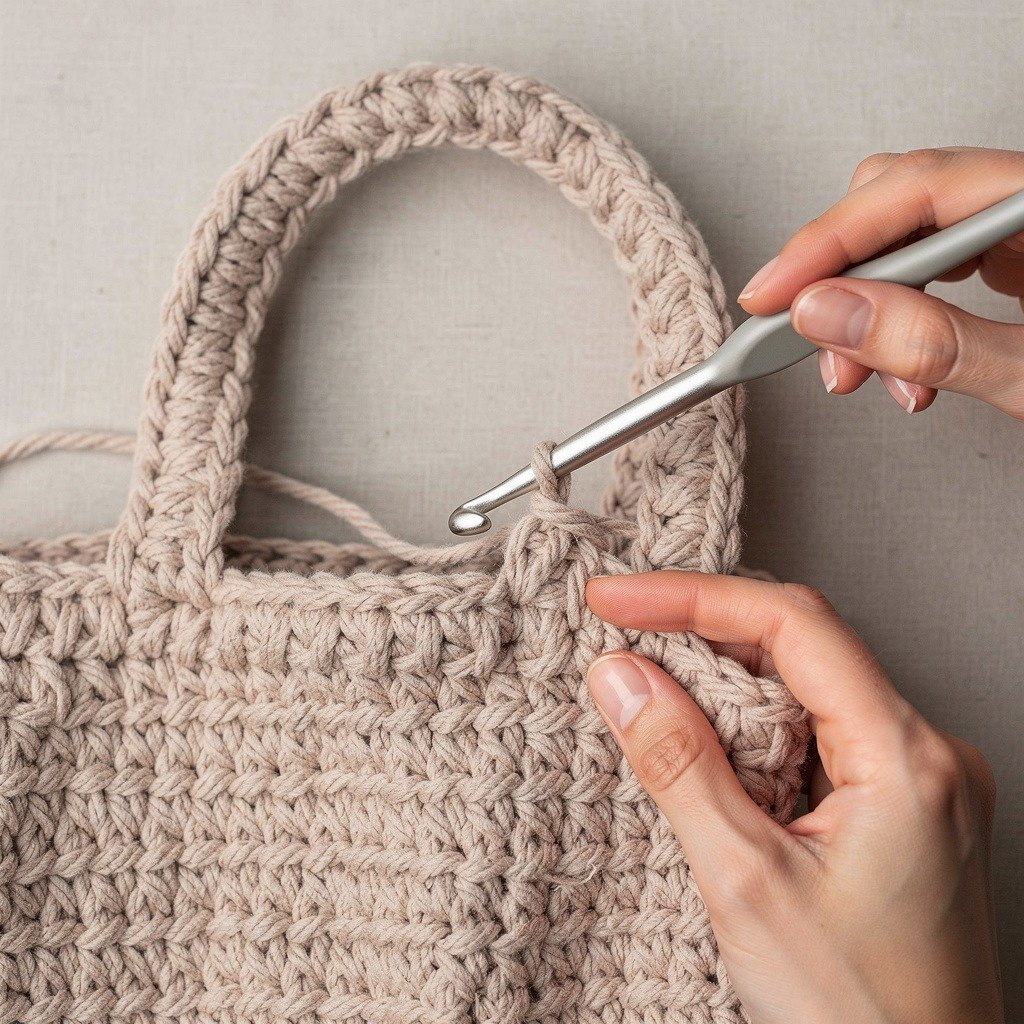 Finally, attach the handles using a yarn needle. Sew them securely so the bag can carry heavier items without stretching.